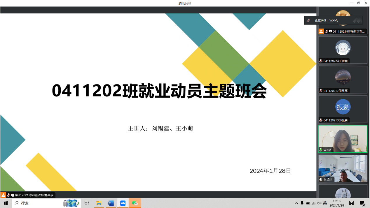 最后每位同学分享自己的毕业设计进度以及就业规划,已落实去向的同学向大家积极分享经验。通过此次交流,毕业班同学对自己的就业规划有了新的认识和思考,学会了用正确的态度面对就业形势,树立了就业信心、确定近期目标方向。