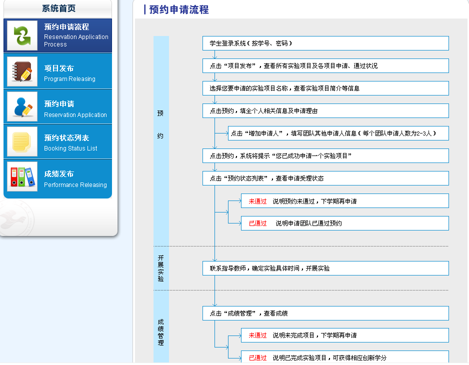 网站地址:http://cxsyyy.sues.edu.cn,也可从集团首页下方的“教学资源服务站点”中快速链接,初始密码为6个“1”。先查看预约申请流程,再选择实验项目,以团队为单位进行申请预约,具体操作由队长一人完成。