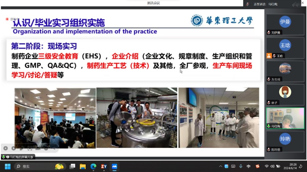 在这次虚拟教研室活动中,马红梅副教授以华东理工大学制药工程专业认识实习、毕业实习以及与企业合作的实践教学模式展开培训,不但强调了实习的目的和意义,指出实习是员工将理论知识应用于实践、培养解决复杂工程问题能力的重要环节,更是将课程思政深度融入到实习教学的相关内容中的环节。