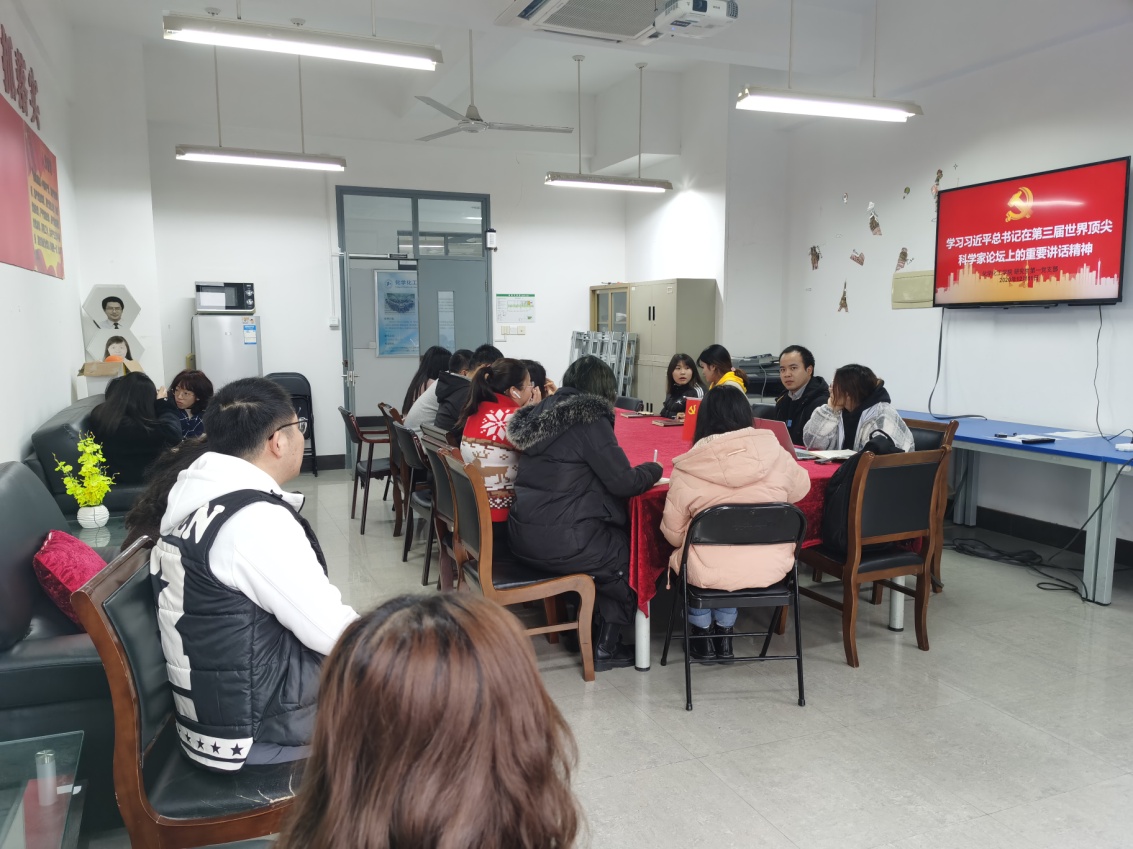 党支部书记杨雅鑫同志首先介绍第三届世界顶尖科学家论坛是由世界顶尖科学家协会发起,上海市委、市政府主办的年度国际科学家论坛,本届论坛以“科技,为了人类共同命运”为主题。习近平总书记谈到:“中国高度重视科技创新工作,坚持把创新作为引领发展的第一动力。中国将实施更加开放包容、互惠共享的国际科技合作战略,愿同全球顶尖科学家、国际科技组织一道,加强重大科学问题研究,加大共性科学技术破解,加深重点战略科学项目协作。”之后,大家一同观看了钟南山院士的致辞,他认为:“世界上有数不清的年轻人会将此次参会的科学家视为偶像,但我们不能满足于此,成为偶像的目的就是要更好消除年轻人对偶像的盲从。通过偶像学到他们对问题的看法,更多地问问为什么,让更多潜在的奖项得主真正为人类社会服务,让科学服务大众。”