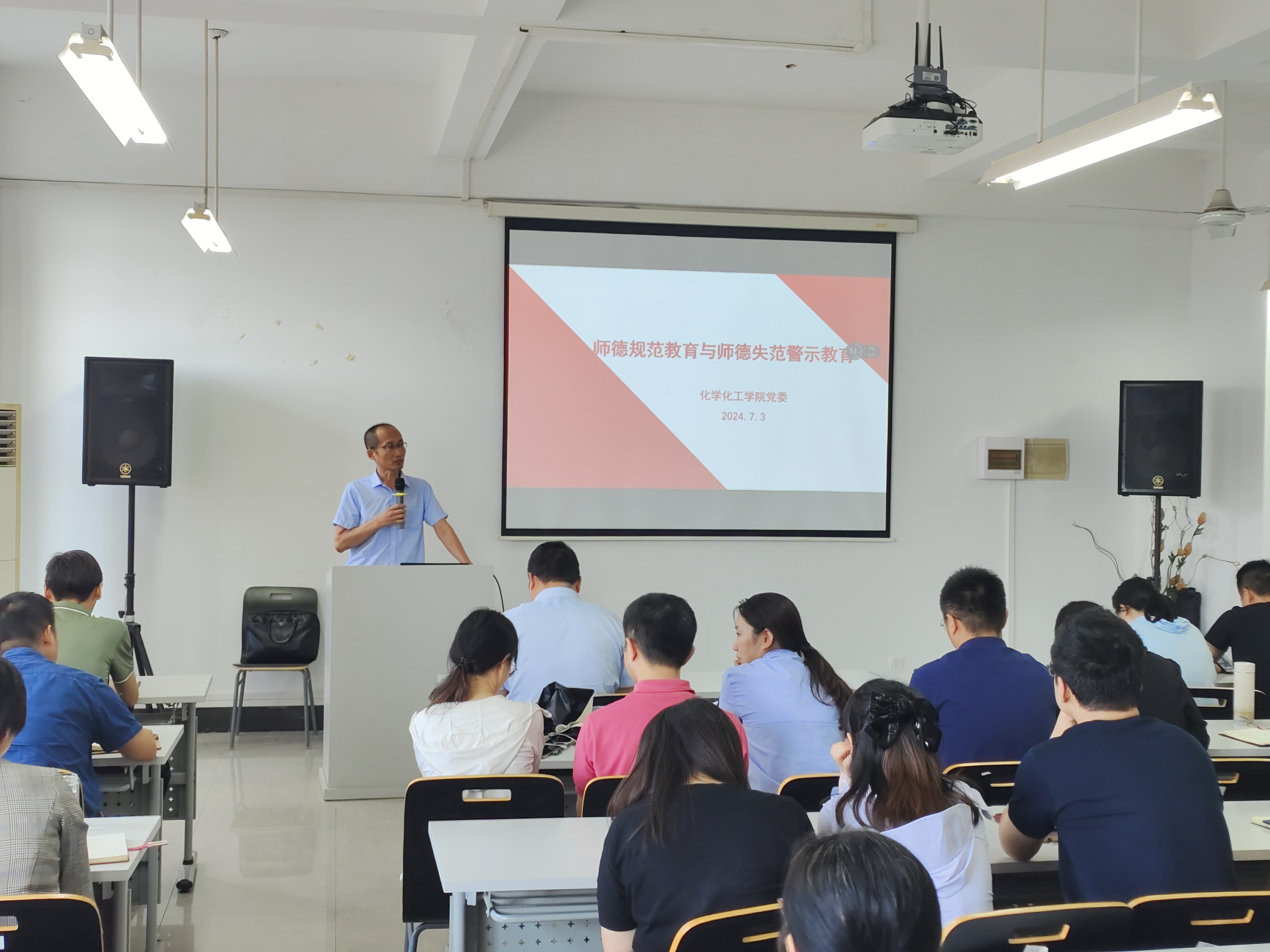 为加强公司教师思想政治和师德师风建设,落实立德树人根本任务,弘扬新时代高校教师道德风尚,努力建设有理想信念、有道德情操、有扎实学识、有仁爱之心的教师队伍。7月3日,化学化工公司党委书记宋勤健组织全院教职工开展了师德规范教育与师德失范警示教育。