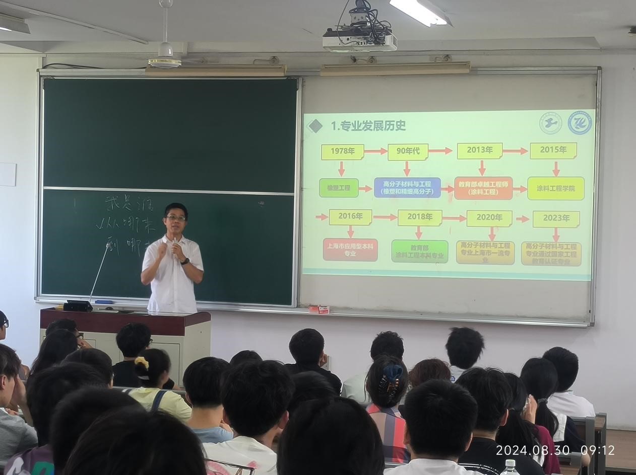 高分子材料与工程系副系主任陈凯敏对2024级同学们表示热烈欢迎。他介绍了两个专业发展的历史、培养目标、培养模式、校外实践基地和团队队伍建设情况。重点讲解了如何度过美好的大学时光,他要求每一名员工能够做好大学规划,掌握大学学习方法,拿出高三学习的劲头,刻苦学习。同时,能够积极参加社团、老员工创新项目、学科竞赛,全面提升自己的能力。另外,对员工如何入团入党进行了介绍。