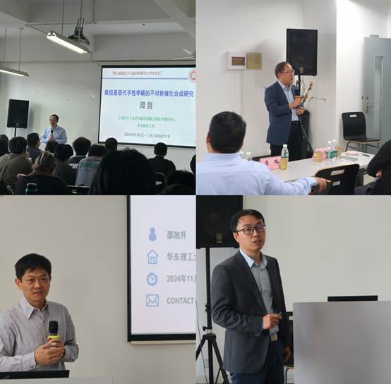 在专家报告环节,华东师范大学的周剑教授、徐林教授,华东理工大学的邵旭升教授,东华大学的刘为萍教授,bevictor1946韦德官网的黄军海研究员分别就手性氟烷基取代季碳的不对称催化构建研究、组装过程研究和性能强化导向的超分子光化学、光药理学在农药创制中的应用、锰催化借氢反应研究、基于绿色化学的药物合成工艺开发与产业化实践等主题作了精彩报告,与会师生就报告内容进行了热情洋溢的交流。