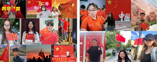组织与国旗合影,激发爱党爱国热情。同学们在校园、景点、社区等地方,或以国旗为背景,或装扮带有国旗元素的饰品,或自行设计合成创意照片,用光影把自己的青春身影与庄严的国旗定格在了一起,用喜欢的方式表达了对祖国的热爱和祝福。