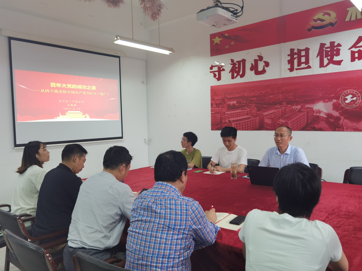 为扎实推进党史学习教育,2021年6月18日下午,在实训楼4号楼4403会议室,化学化工公司党委书记宋勤健为公司师生党员作了《百年大党的成功之道——从四个维度悟中国共产党为什么“能”》的专题党课。