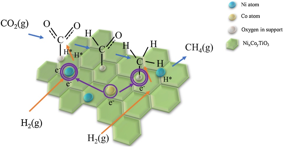 通过钴改性调控NiTiO3催化剂中表界面结构,设计制备了具有高反应活性表界面结构和良好稳定性的CoxNiyTiO3催化剂,为高效非贵金属催化剂的设计和开发提供了新思路。此项研究成果发表于CO2国际知名期刊《Journal of CO2 Utilization》(系中科院SCI分区2020年12月最新升级版工程技术大类二区期刊,IF=7.132),题为“Highly stable and selective CoxNiyTiO3 for CO2 methanation: Electron transfer and interface interaction”(https://doi.org/10.1016/j.jcou.2021.101743, 第一作者:蒋凯鸣,通讯作者:门勇教授)。