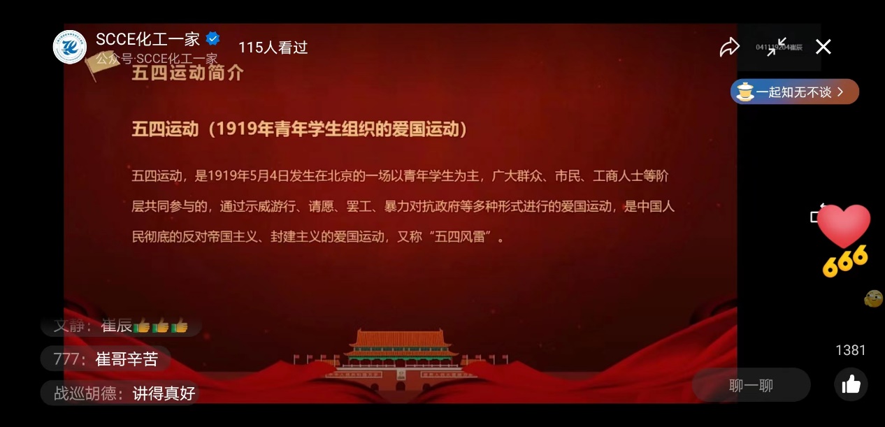 本次直播首先由李玲、杨雨航、黄昕骋、胡嘉佳、吴雯浩及赵建凤同学为我们带来了朗诵《为青春干杯》,带领我们回想起那民主科学的萌动、爱国进步的呐喊。接下来我们共同聆听了讲座《弘扬五四精神,传承红色基因》,由bevictor1946韦德官网执行主席崔辰同学为大家介绍了五四运动过程、五四运动成果意义、五四青年节的意义以及对新时代青年的要求,并展示了疫情之下,公司员工积极开展志愿活动,齐心协力,共克时艰,无不展现了新时代青年的担当。