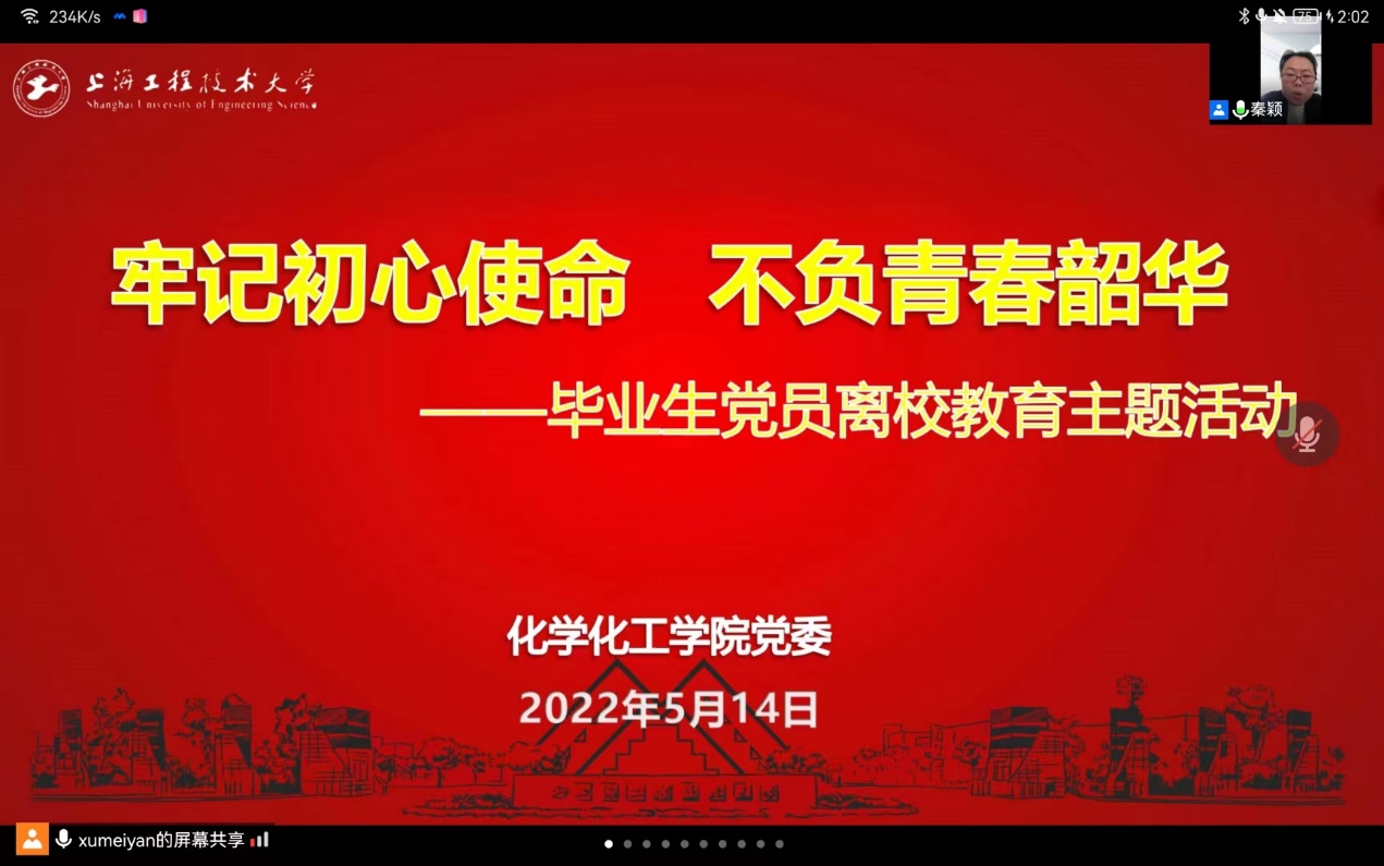 为进一步强化毕业生党员的身份意识,引导毕业生党员坚定理想信念,勇担时代重任,5月14日下午,化学化工公司党委在线开展“牢记初心使命,不负青春韶华”毕业生党员离校教育活动。公司党委书记宋勤健,公司关工委常务副主任卢柏龙,公司党委副书记秦颖,公司党委组织员、员工党支部书记和全体毕业生党员出席会议,会议由公司党委副书记秦颖主持。