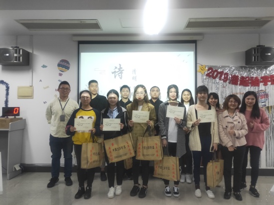 最后,来自航空公司本科生潘佳琳和来自中韩多媒体公司的研究生许王旭宇组成的第三组经过激烈竞争摘得本次活动的桂冠。四位评委老师分别为获奖选手办法了荣誉证书和奖品,并合影留念。