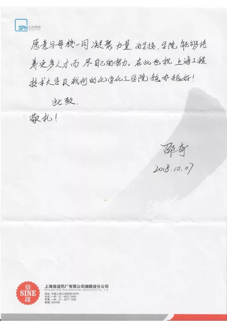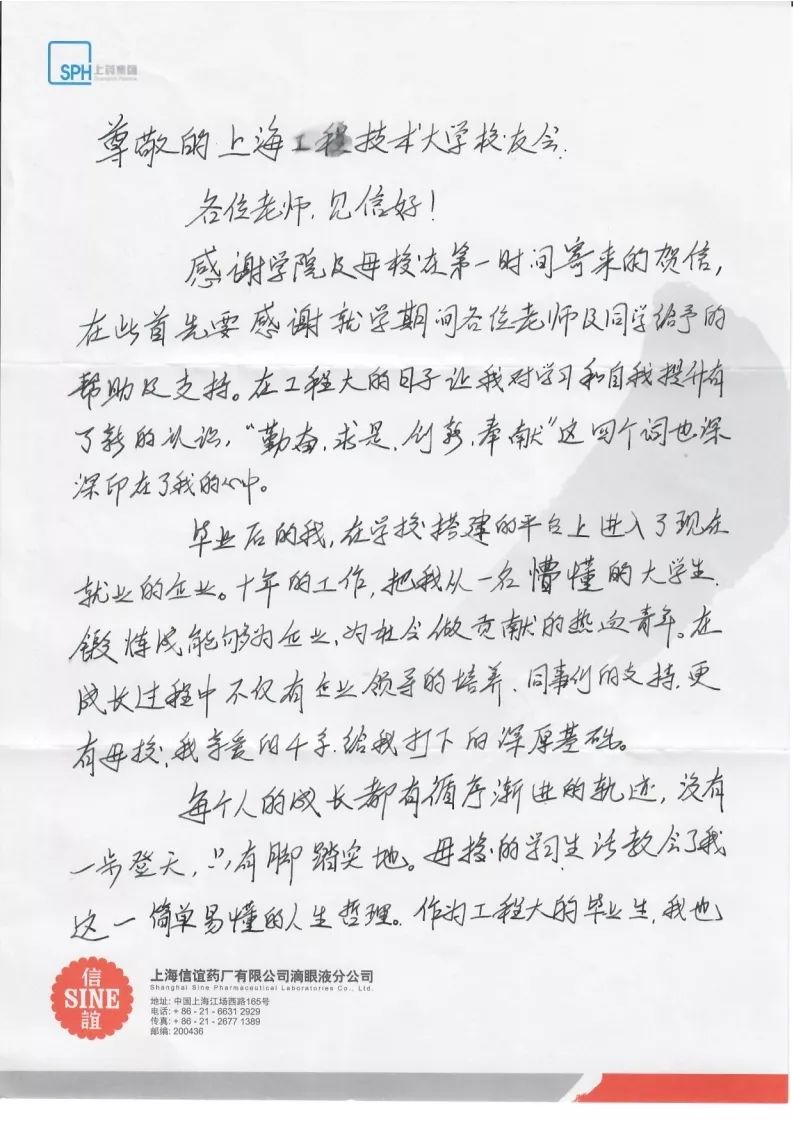 收到贺信,邵奇员工非常感动,他手书感谢信向母校表达了诚挚的谢意。