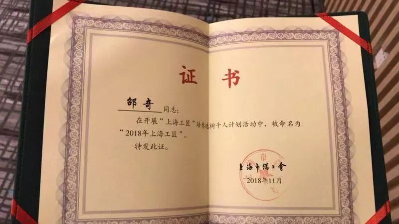 受表彰的2018年上海工匠名单里,公司杰出员工邵奇赫然在列。
