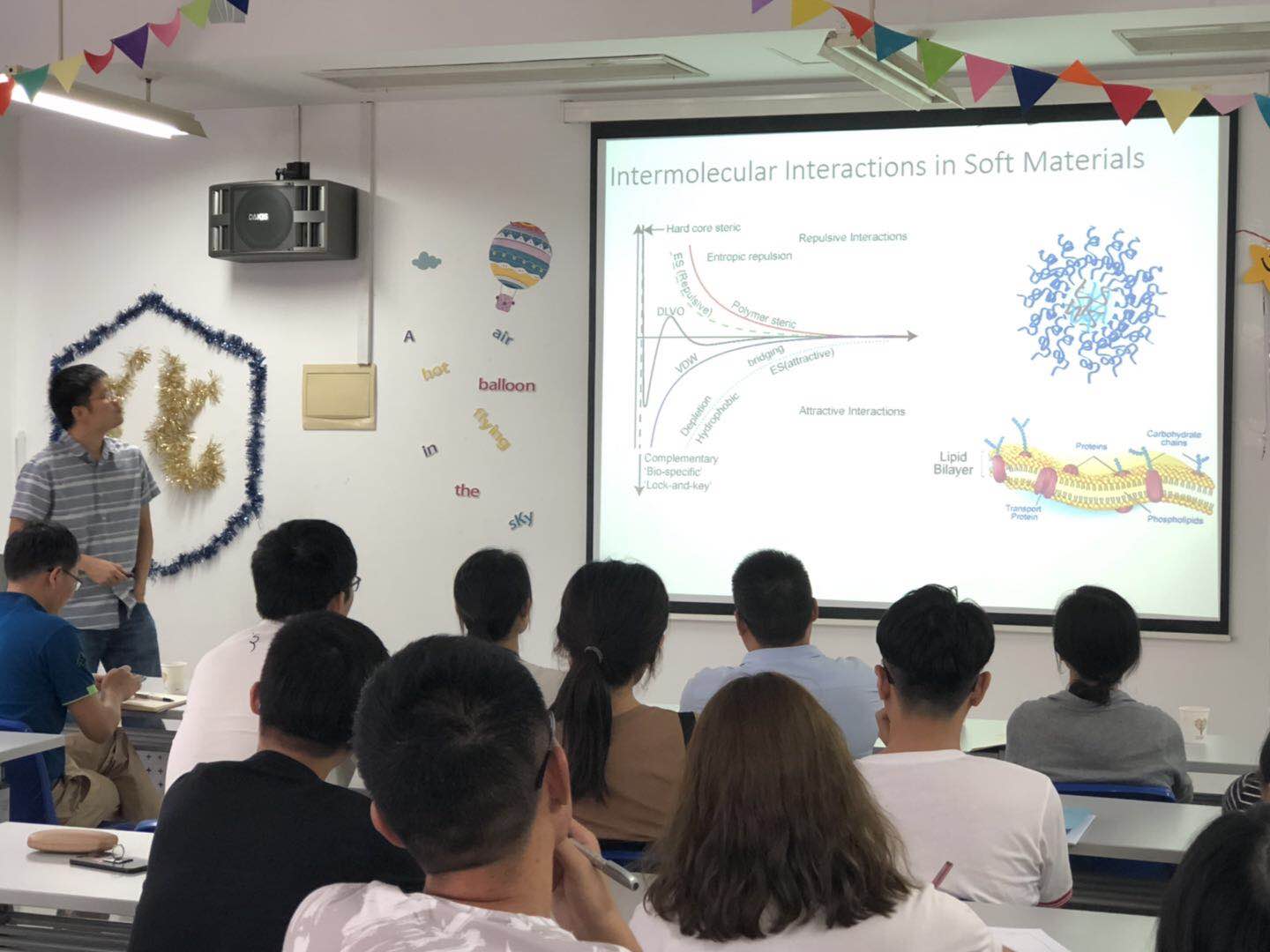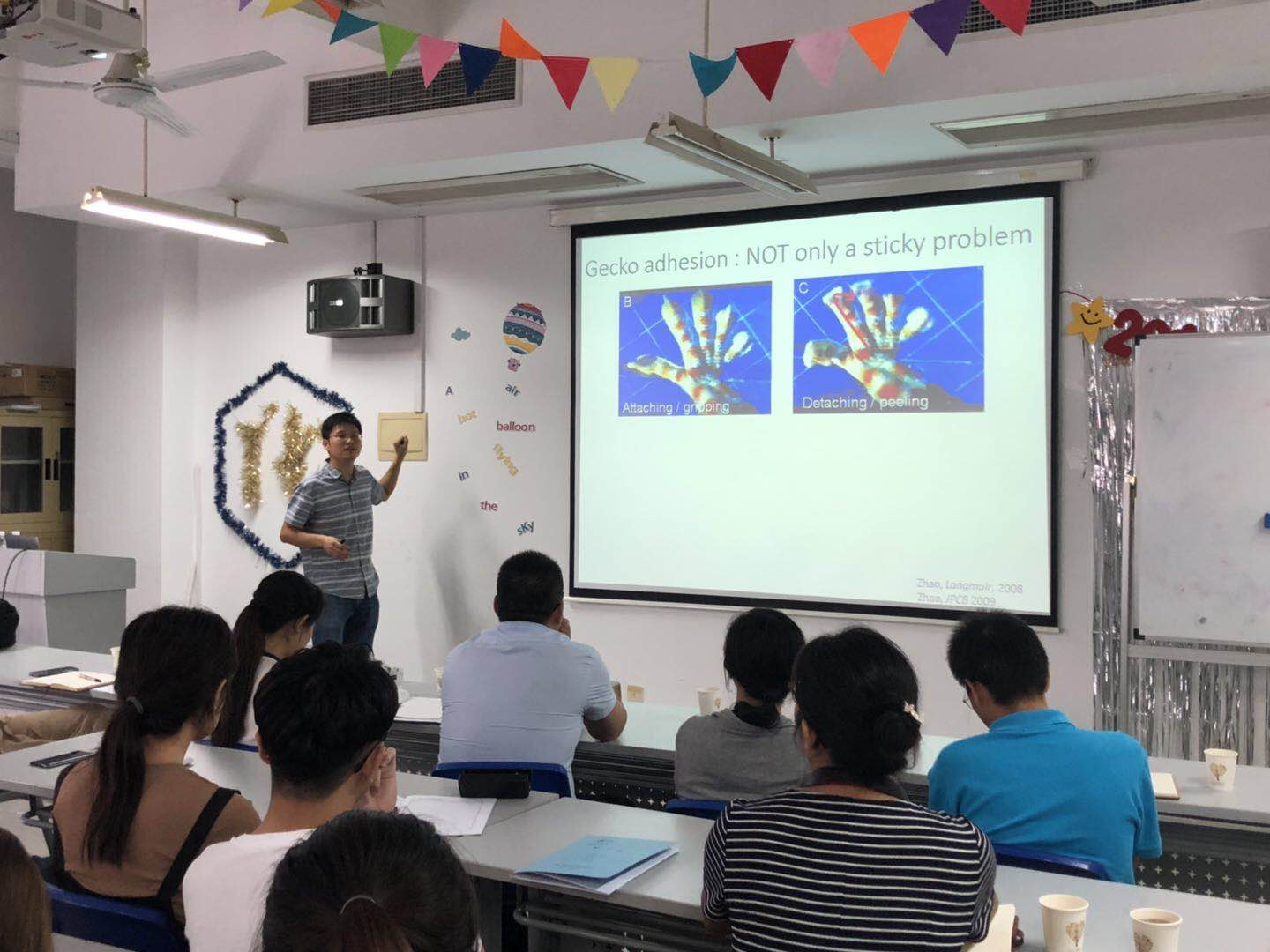 俞璟教授介绍了其近期在可穿戴的柔性传感器方面的工作,柔性可穿戴传感器在人类生命健康个性化监测方面有非常迫切的需求和广阔的应用前景,有望提高人类的健康水平和提供更丰富的诊断信息,目前也是材料学、化学、信息学等交叉学科的研究的热点。针对目前柔性传感器在皮肤粘附方面存在的问题,俞璟教授课题组提出一种壁虎仿生结构,调控其粘附力,实现在湿润环境的可靠粘附、高的信息传输、可重复使用等特性。俞璟教授的报告内容丰富、生动活泼、深入浅出,将高深的科学问题讲的通俗易懂,与会师生深受启发,开阔了眼界。会后,与会师生向俞教授请教了一些相关问题,进行了愉快、深入的互动交流,师生们受益匪浅,反响热烈。