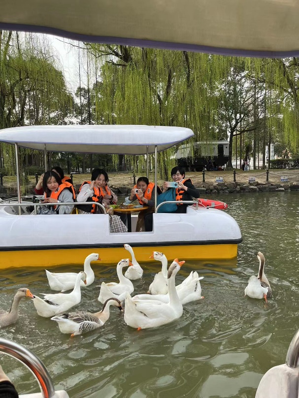 活动最后,女教师们泛舟湖上,欢声笑语引来一群白鹅环绕。此次活动不仅缓解了女教职工们紧张繁忙的工作压力,还增进了同事之间的友谊,增强了凝聚力和向心力,今后能够以更加饱满的热情在工作岗位上绚丽绽放。