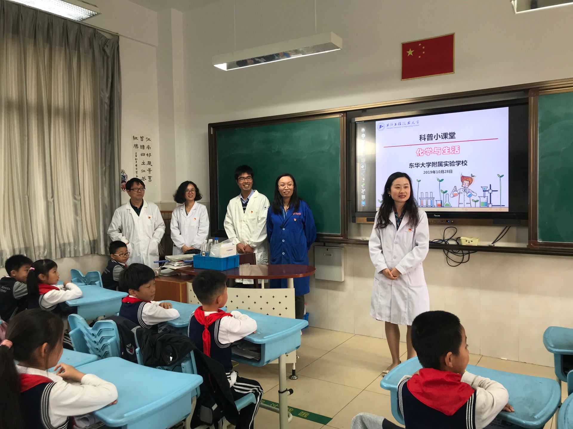 深入贯彻落实“不忘初心、牢记使命”主题教育为人民群众办实事、办好事要求,10月28日下午,化学化工公司党委制药工程专业教工党支部进入东华附属实验公司课堂,开展主题为“化学与生活”的科普志愿服务活动。通过故事讲述导入化学基本概念,通过案例分析神奇现象的化学原理,通过生活中化学品(筛选安全无害,优选食品级)进行实验演示,有效激发了少先队员们对化学的兴趣,培养其科学素养。