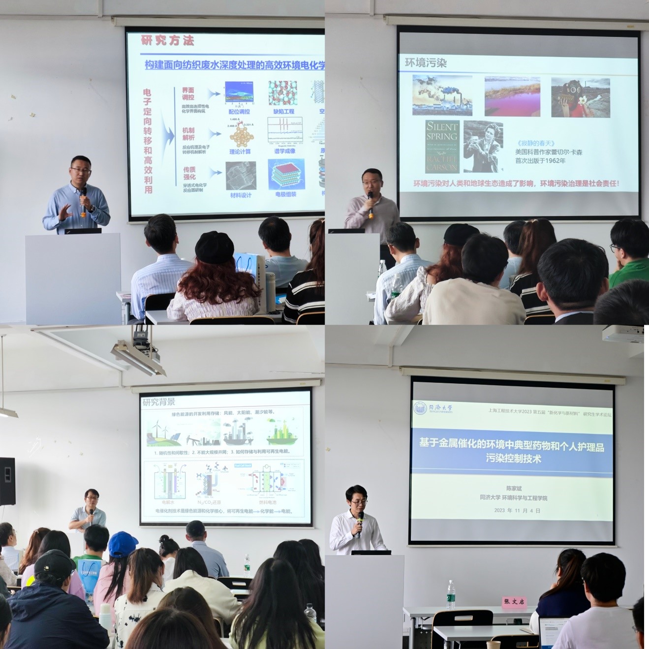 在专家报告环节,东华大学的刘艳彪教授、上海师范大学的蒋波教授、同济大学的毛舜教授、同济大学的陈家斌教授分别就电活性膜净水效能与机制研究、介孔金属材料的精准合成及电催化研究、基于新型荧光探针的环境污染物可视化分析方法、基于金属催化的环境中典型药物和个人护理品污染控制技术等主题作了精彩报告,与会师生就报告内容进行了交流。
