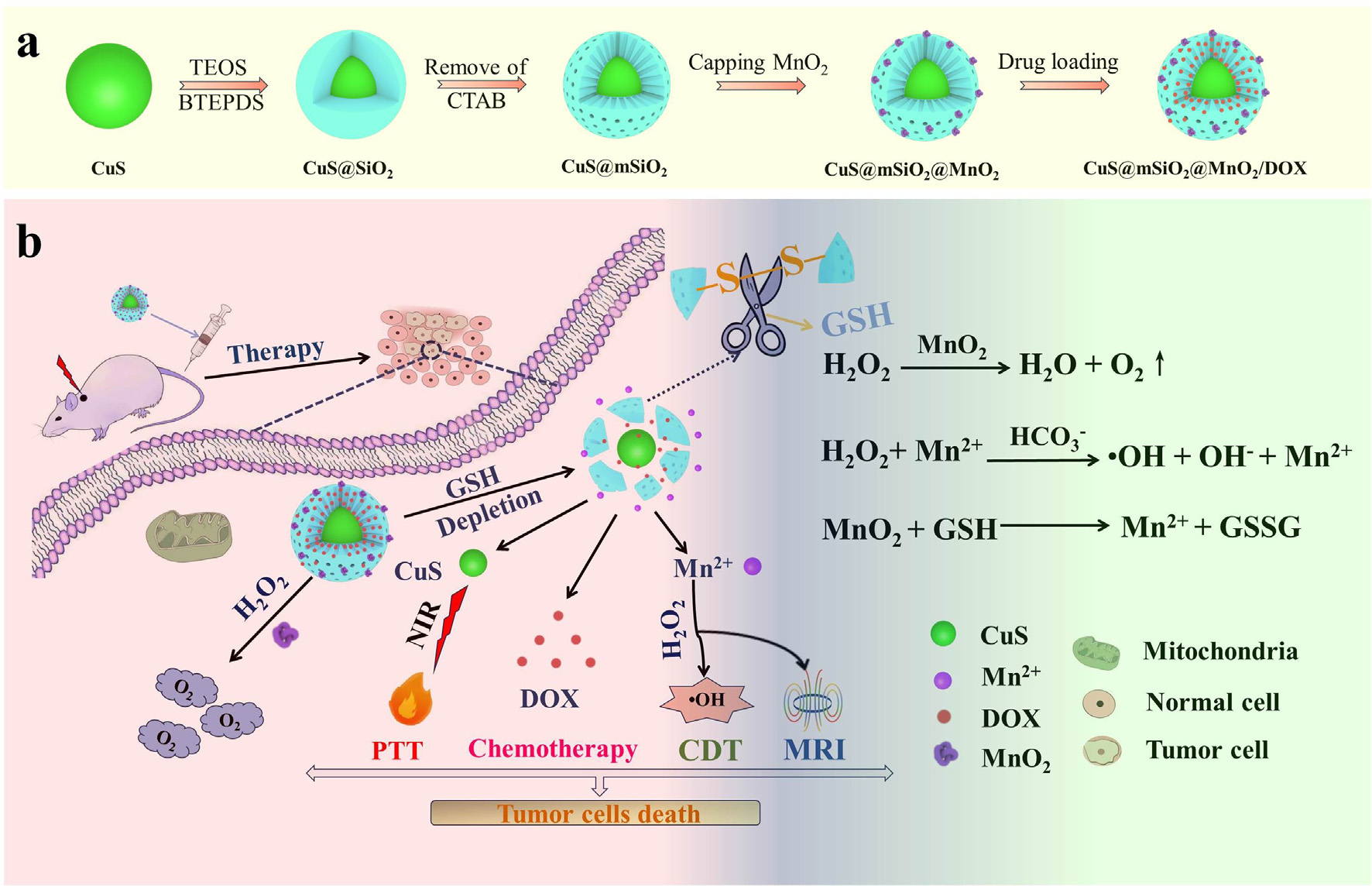 癌症是一种威胁人类健康的严重疾病,但目前在癌症诊疗方面没有特别有效的方法。面对以上难题,公司bevictor1946韦德官网刘锡建副教授和陆杰教授指导研究生张旻昳开发了一种可降解的智能纳米诊疗试剂,该智能纳米试剂负载抗癌药物通过EPR效应聚集在肿瘤区域,由于肿瘤区域高浓度的谷胱甘肽、弱酸性和存在少量H2O2等特性,纳米试剂可在肿瘤区域响应降解,释放化疗药物,纳米试剂表面的MnO2与谷胱甘肽反应生成Mn2+可以作为核磁成像试剂引导治疗,同时MnO2与H2O2反应可生成氧气,缓解肿瘤乏氧情况提高化疗效果,生成Mn2+又可以催化H2O2分解生成羟基自由基进行化学动力学治疗,另外近红外激光照射可以驱动光热治疗,从而实现核磁成像引导下的化疗/化学动力学治疗/光热治疗协同增强治疗效果,能够完全清除肿瘤。该项研究得到上海市第一人民医院的技术和实验支持,得到了国家自然科学基金(21978165, 31701032)的资助。