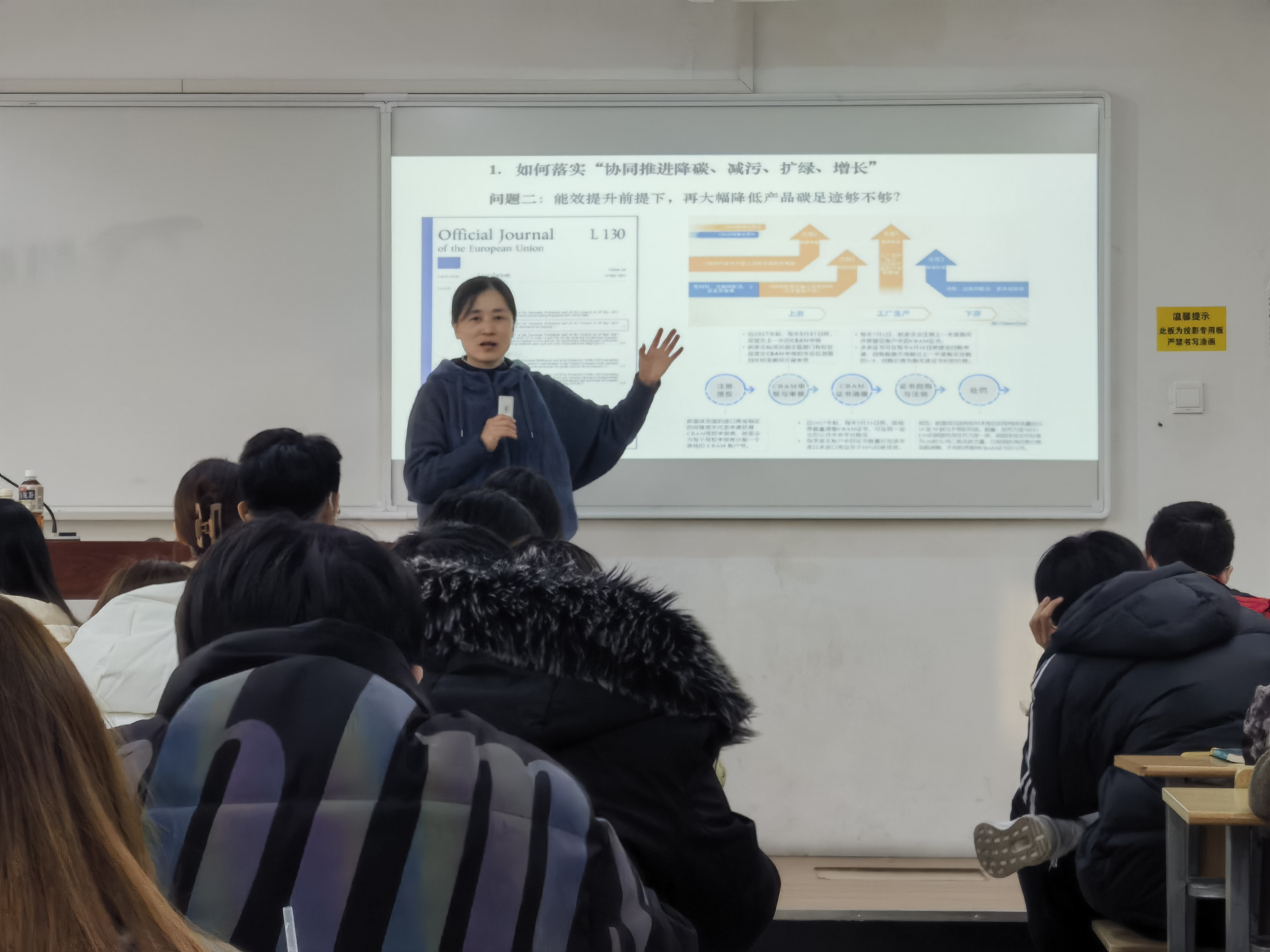 胡静主任讲座围绕如何理解与如何落实“协同推进降碳、减污、扩绿、增长”展开。她首先结合国家发展战略和团队实践经验向同学们介绍了当前我国环境政策研究面临的新挑战和机遇。随后,她对党的二十大报告中提出的“推动绿色发展,促进人与自然和谐共生”的新发展要求、习近平总书记在全国生态环境保护大会上的重要讲话内容以及 “十四五“节能目标责任评价考核工作方案进行了解读。接着,胡主任转向国际视角,梳理了欧盟碳边境调节机制和《电池与废电池法》的核心要素,并结合我国《高耗能行业重点领域节能降碳改造升级实施指南》和国家发改委等部门的指导意见分析了我国相关行业面临的压力和对策。最后,胡主任指出我国需要加快完善碳交易市场建设,积极参与国际碳定价规则制定,提升气候治理话语权。她勉励在座的每一位同学视自己的专业为一种“崇高的职业”,负重前行,奋发进取,为国家的“双碳”战略做出贡献。