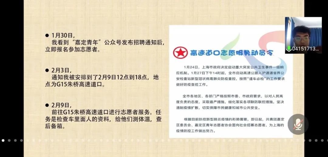 他看到“嘉定青年”公众号发布招聘通知后,立即报名参加志愿者。前往G15朱桥高速道口进行志愿者服务。任务是检查车里面人的资料,给他们测体温,检查后备箱。
