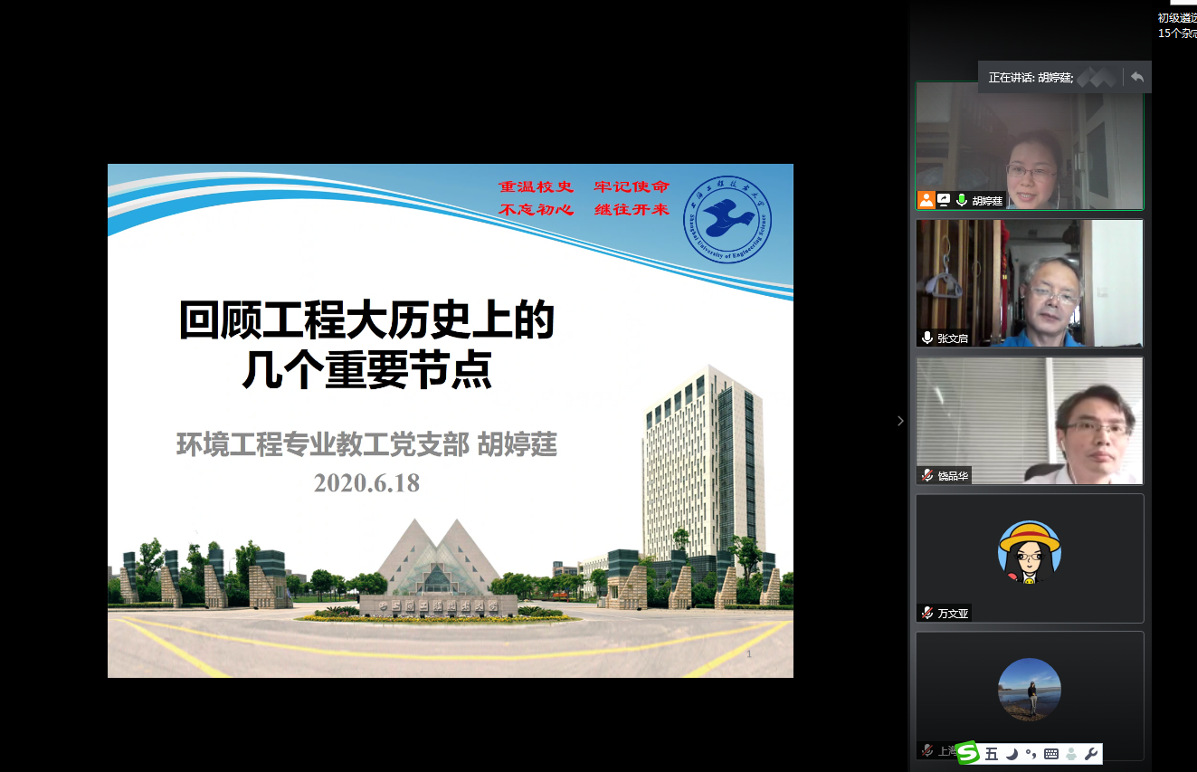 bevictor1946韦德官网环境工程专业教工党支部于2020年6月18日上午10:30通过腾讯会议平台开展了 “四史”学习专题党课——“工程大历史的几个重要节点及其思考”。会议由支部书记胡婷莛同志主持,支部全体党员同志和部分观摩团教师党员参加。